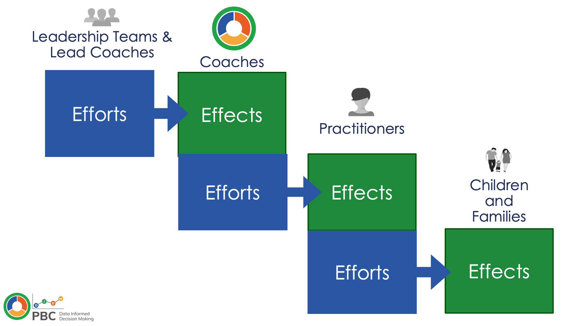 Download fillable PBC-DIDM Effort and Effect Cascade Handouts below to help your program reflect on how efforts and effects across different levels of implementation (e.g., leaders, coaches, practitioners) are connected.