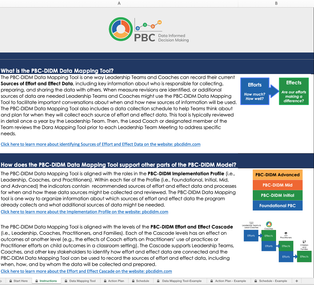 The Practice-Based Coaching Data-Informed Decision Making (PBC-DIDM) Data Mapping Tool is one way Leadership Teams and Coaches can record their current Sources of Effort and Effect Data, including key information about who is responsible for collecting, preparing, and sharing the data with others.